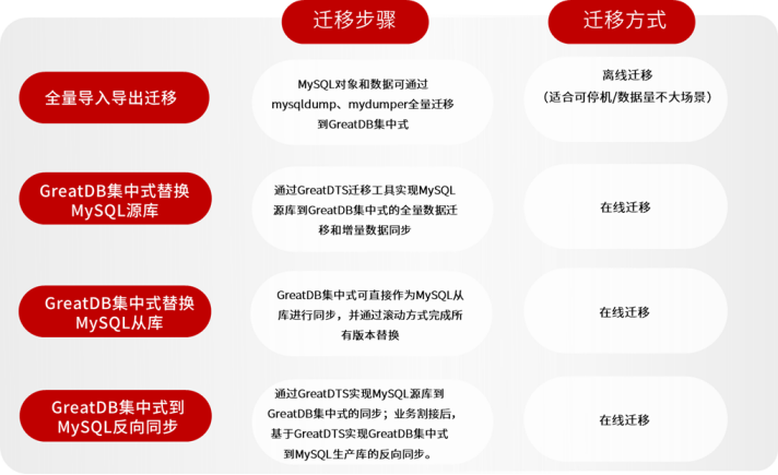 针对全量导入导出、MySQL源库、MySQL从库、MySQL反向同步4类客户常见的应用场景,万里数据库给出了4类不同的迁移步骤以及相匹配的迁移方式。