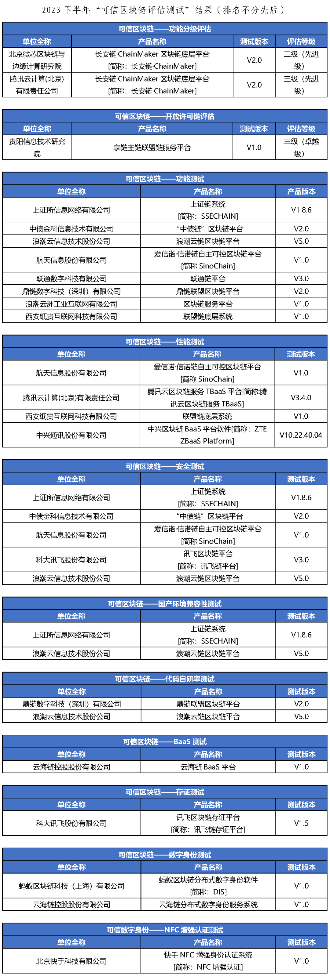 2023年11月28日,2023下半年“可信区块链评估测试”专家评审会在中国信息通信研究院(简称“中国信通院”)召开。本次评审邀请了北京大学、清华大学、中国科学院大学、北京交通大学、北京邮电大学、北京工业大学等单位专家,以及参评企业代表组成评审委员会,对相关测试内容进行评审。经产品资料审核、测试报告审核、参评单位答辩、质询与答疑、集中评议5个环节,共计16家单位的29款区块链产品通过评测。具体名单如下: