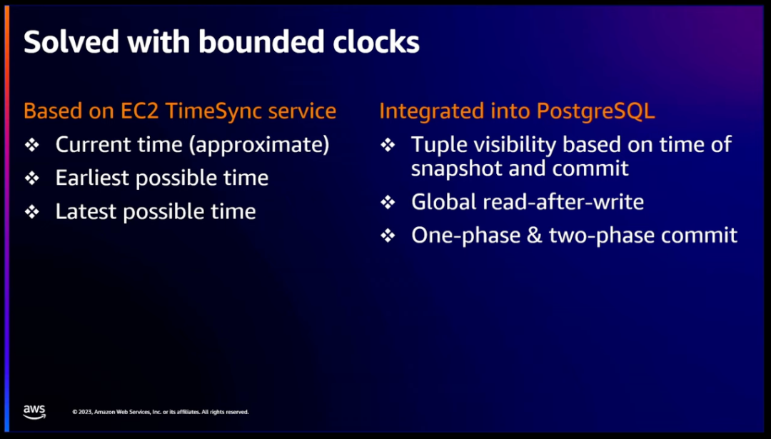 作为分布式系统,Aurora Limitless 的全局时间戳是通过 EC2 TimeSync Service 获得的,虽然协议上使用了 NTP,但是精度上更接近 Google 提出的 TrueTime 方案,把时间误差控制在了毫秒级别[3]。Aurora Limitless 支持全局范围的写后读、本地事务(一阶段提交)和分布式事务(两阶段提交),在 RR 和 RC 两种事务隔离级别下的体验完全对齐 PostgreSQL 的单机事务。