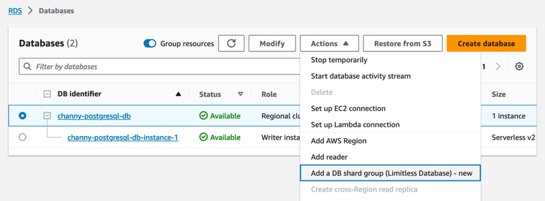 首先,用户需要通过 AWS Console 或者 API 为指定的 Aurora 集群开启 DB Shard Group: