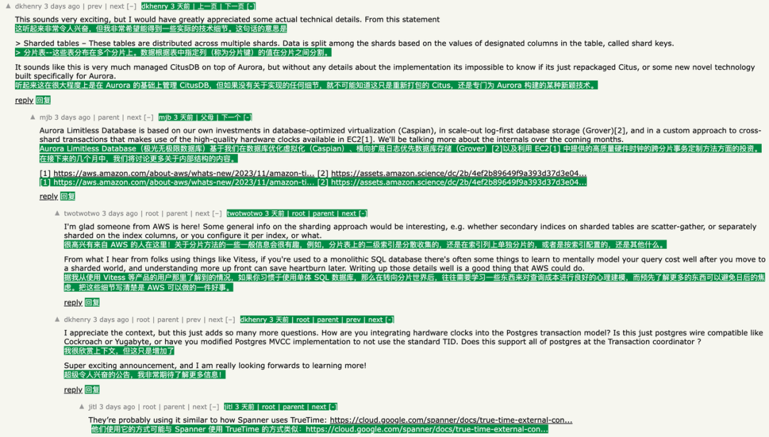 Hacker News 的热心群众对 Aurora Limitless 褒贬不一:有开发者认为 Limitless 是一个有野心的想法,迫不及待想要在生产环境使用;而有的开发者则认为 Limitless 只适合财富 500 企业,并不适合初创公司[8]。关于 Citus 魔改换皮的猜测,引得 AWS 官方不得不下场解释了一番,顺便炒了一下 Aurora 论文的冷饭[9]。