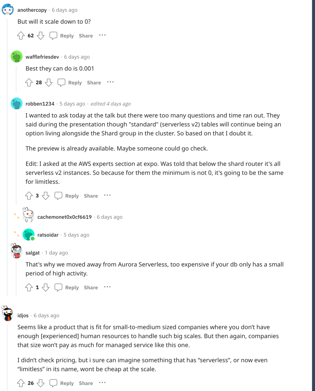 Reddit上也有类似的讨论。很多人在质疑这个是不是能scale down到0,也有人会说性价比的问题以及什么程度的数据量才值得去采用 Aurora Limitless。