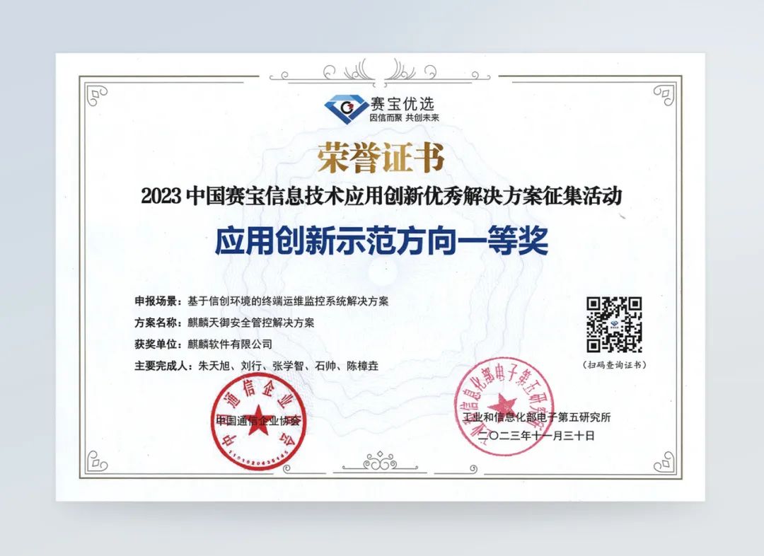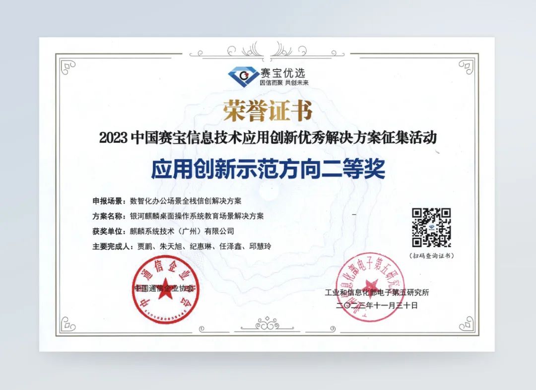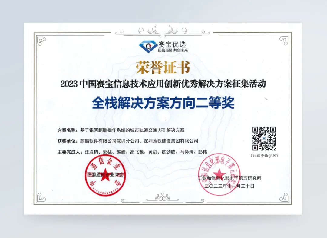征集活动自今年9月启动以来,共收到来自全国279个方案报名参赛,麒麟软件此次申报的解决方案广受好评。凭借在行业中积累多年的落地实践经验,麒麟天御安全管控解决方案勇夺应用创新示范方向一等奖,银河麒麟桌面操作系统教育场景解决方案被评为应用创新示范方向二等奖。而基于银河麒麟操作系统的城市轨道交通AFC解决方案则荣获全栈解决方案方向二等奖。