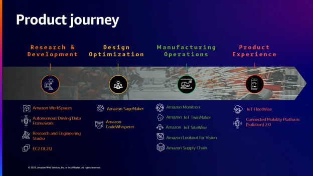 产品旅程(product journey)覆盖研发、设计优化、制造运营、产品体验等环节,亚马逊云科技围绕该链条中这些环节提供了诸多服务。