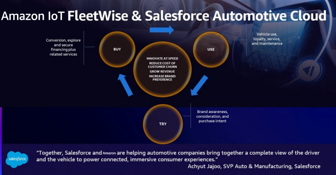 亚马逊云科技与 Salesforce 合作推出 Amazon IoT FleetWise & Saleforce Automotive Cloud,为客户提供了丰富的准实时车队洞察,使得准实时车队数据的访问变得更加便捷,提高了客户参与度,从而增强了客户体验。