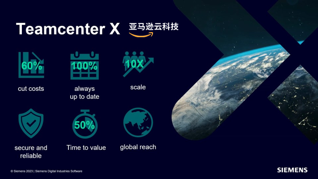 Siemens Digital Industries Software 总裁和 CEO 分享了 Teamcenter X 将在亚马逊云科技上以 SaaS 服务推出,可帮助工业客户成本降低60%,100%时刻保持最新,10X 扩展,上市时间缩短50%,并实现安全可靠和全球覆盖。运行在亚马逊云科技上的 Teamcenter X 处理整个 PLM 环境中的操作、管理和安全,使组织能够更加创新、敏捷和富有创造力。