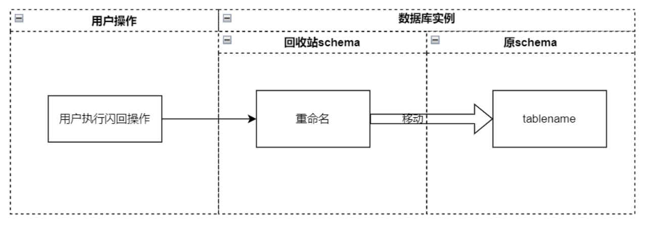闪回时,用户执行闪回操作之后,在原schema中会判断是否存在同名表,如果同名表不存在,则直接重命名,把表从回收站移动到原schema;如果同名表存在但是表结构相同且表中无数据,则直接删除同名表,然后重命名,把表从回收站移动到原schema;如果同名表存在且表结构不同或表中有数据,用户可以选择强制闪回,则会删除同名表,然后重命名,把表从回收站移动到原schema,否则报错退出,如下图所示: