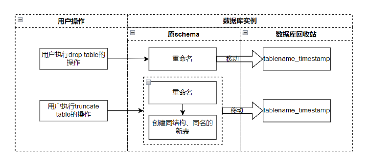 用户对表执行drop table操作时,并不是真正的删除,而是把该表进行重命名,在表名后面添加时间戳,然后移动到回收站(名为adb_trashcan的schema)进行保存;当用户对表执行truncate table操作时,把表重命名,移动到回收站进行保存,然后会在原schema中创建一个与原表具有相同结构,和名字的空表,如下图所示: