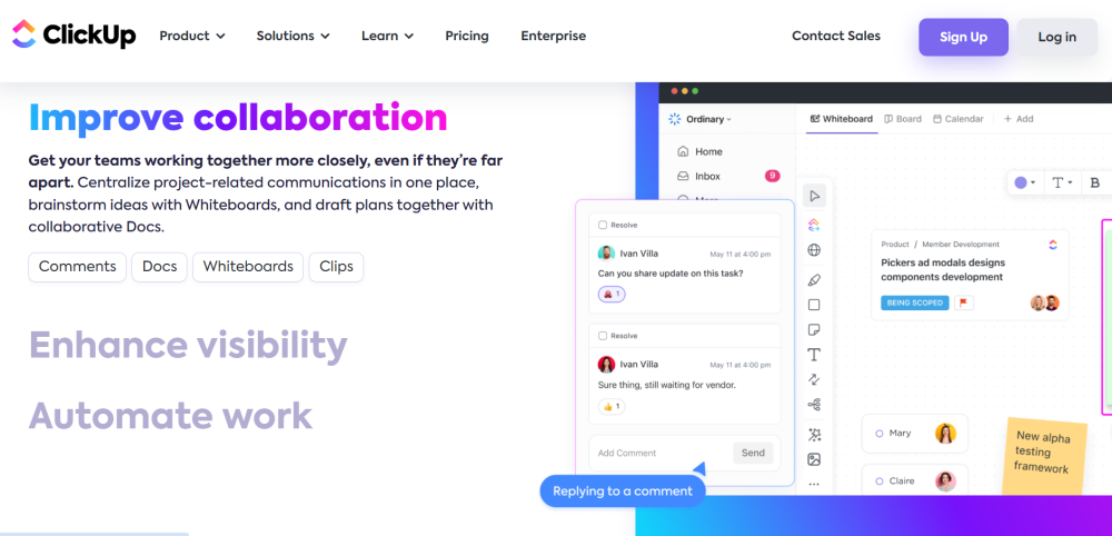 ClickUp 是小型和大型公司团队使用的高度评价的生产力和思维导图工具。它提供了可定制的功能来提高工作流程效率,并提供了两个强大的思维导图工具:思维导图和白板。它是远程项目管理的理想选择,可帮助团队克服虚拟团队挑战,同时跟踪绩效。
