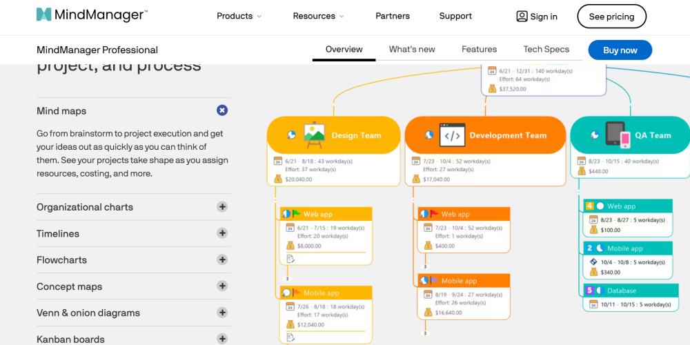 MindManager 是一款思维导图应用程序,非常适合深入的头脑风暴会议。它的拖放功能简化了中心和相关想法的创建。实时协作和各种可视化工具增强了体验。“快速快照”功能可实现快速知识收集。MindManager 与 Microsoft Teams、Asana、Google Workspace 等无缝集成。
