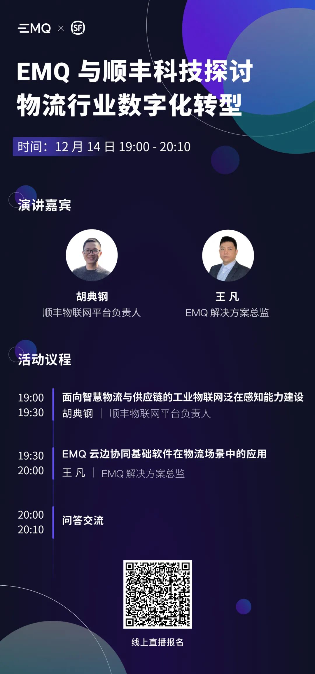 12 月 14 日晚上 7:00 点,国内物流巨头顺丰科技将和 EMQ 一起举办线上研讨会,讨论物联网数据基础软件在物流数字化转型中的关键作用。