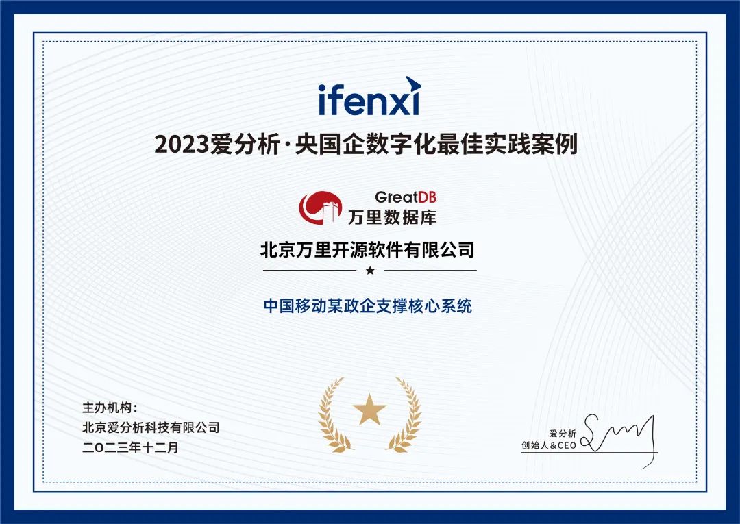 近日,“2023爱分析·央国企数字化最佳实践案例”评选活动落下帷幕。活动面向落地央国企数字化的各行业企业和央国企数字化厂商,围绕实践领先性、案例创新性、应用成熟度、价值创造四个维度进行评选,经过申报、初评、调研、终评多轮角逐,万里数据库支撑的中国移动某政企支撑核心系统成功入选《2023爱分析·央国企数字化最佳实践案例》,被评选为具有参考价值的创新案例,并颁发实践案例证书。