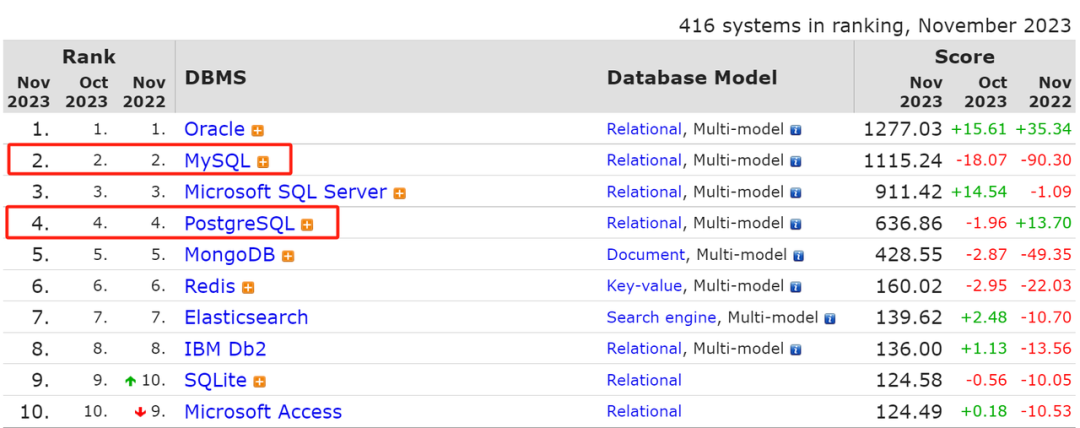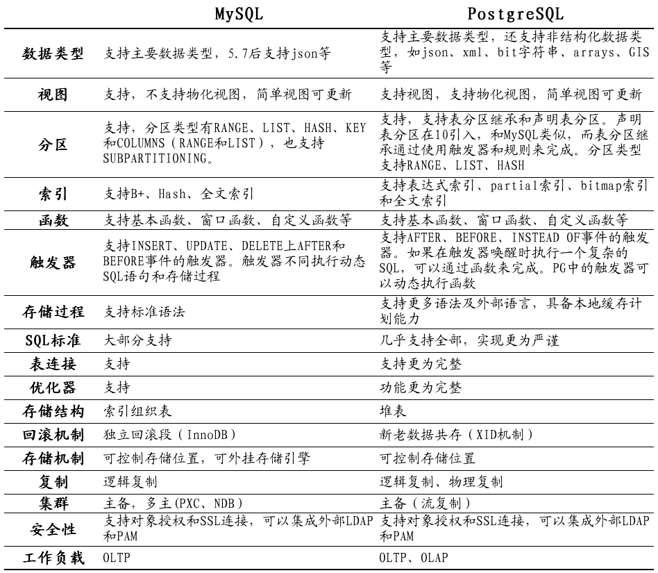 作为流行的开源数据库佼佼者,这两款产品各有其优势和特点。MySQL 数据库,在二十多年前随着互联网兴起,得到了广泛的应用,其以轻量化、简洁著称;特别是其核心的存储引擎-InnoDB,更以其稳定架构、卓越性能而成为默认存储引擎,得到大量应用。PostgreSQL 数据库,则是一种典型的学院派产品,业内常用一种说法,称其是作为最为强大的开源数据库,具备大量企业级能力(如优化器等)。可以说,两个数据库各有所长,之前也在企业不同场景发挥着重要的作用。下表是针对两种数据库的功能对比。