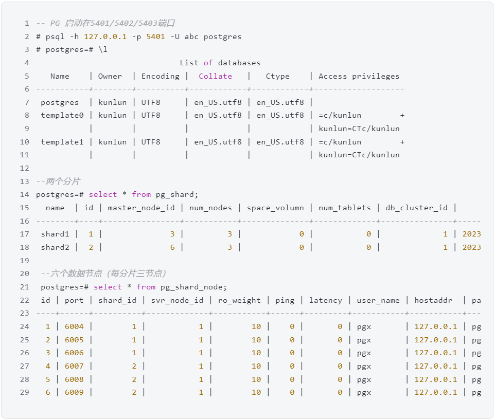 一个数据库的功能非常庞杂,因个人精力有限,只测试了部分功能。针对昆仑数据库,其生态兼容性特点很突出,兼容了最为流行的两款开源数据库 MySQL 和 PostgreSQL。这里所说的兼容,包括了协议、语法等多层面。下面示例就将依次使用 PostgreSQL 和 MySQL 两种方式,看看使用体验如何。首先我们通过 PostgreSQL 方式连接测试实例,看看整体集群的情况。