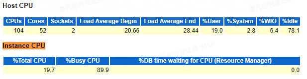 以某投顾类系统的资源估算为例,分别拉取其晚上跑批和白天高峰查询时段的AWR报告、运行监控报告。根据原数据库AWR负载报告、运行监控报告,发现白天交易峰值期间CPU使用率19.7%,夜间批量CPU使用率4.2%。近1个月CPU峰值不超过50%,内存使用约50%-60%。因此给出如下资源预估: