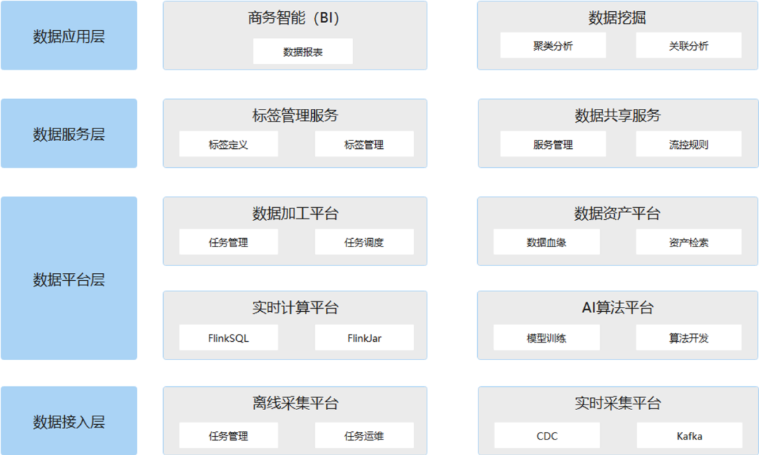 数据平台层包含数据加工平台(即数据开发)、实时计算平台、AI算法平台和数据资产平台。