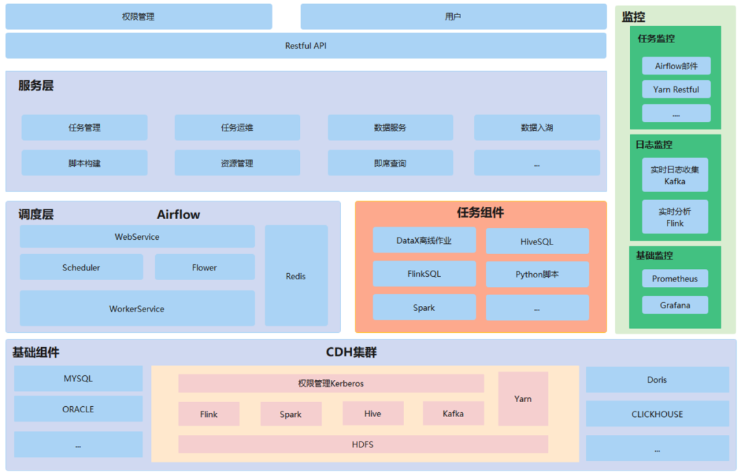 基础组件包括MySQL、Oracle、PostgreSQL等关系型数据库,以及像Doris、ClickHouse等OLAP数据库。我们的数据底座是基于CDH集群构建的,其中包含Flink、Spark、Hive、Kafka、Yarn等组件。