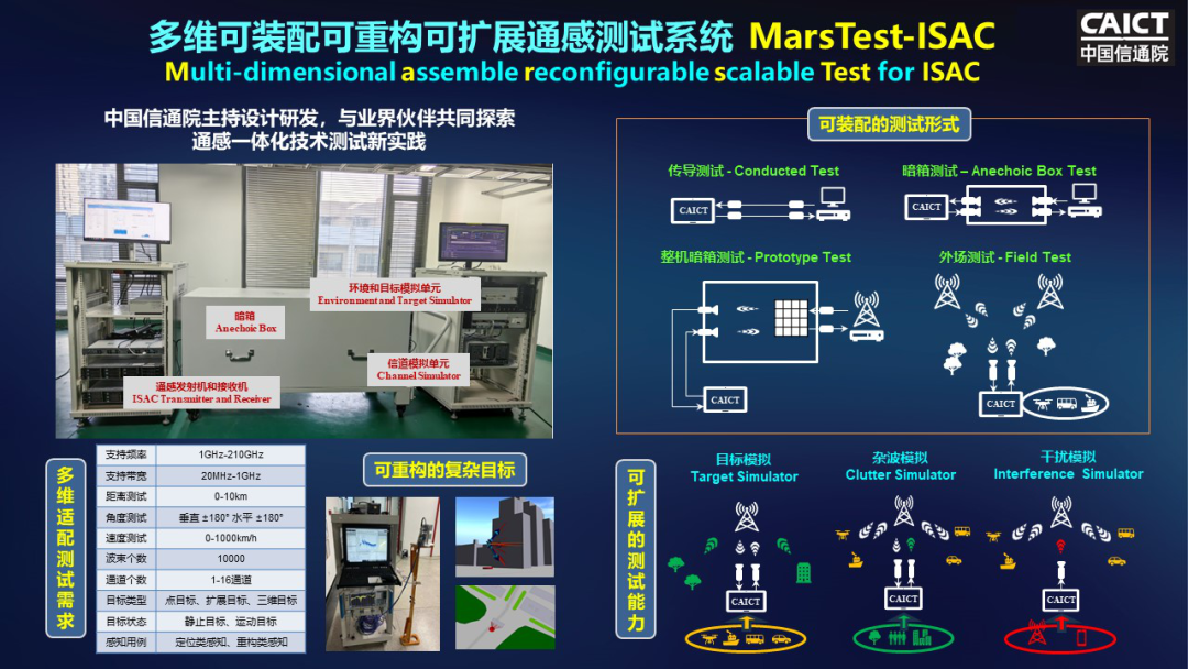 大会期间还组织了6G技术研发成果巡展活动,集中展示了通信感知测试系统、通信和人工智能融合、太赫兹通信等多款6G概念样机。其中,首次展示了由中国信息通信研究院移动通信创新中心自主设计和主持研发的多维可装配可重构可扩展通感测试系统(MarsTest-ISAC),能够多维度满足通感技术的测试需求,支持可装配模块化的技术测试方案,生成可重构定制化的“复杂目标”模拟数据,具备可扩展全场景的技术测试能力。目前该系统已与多家企业完成对接测试,为推动通感一体化技术优化和熟化提供重要助力。