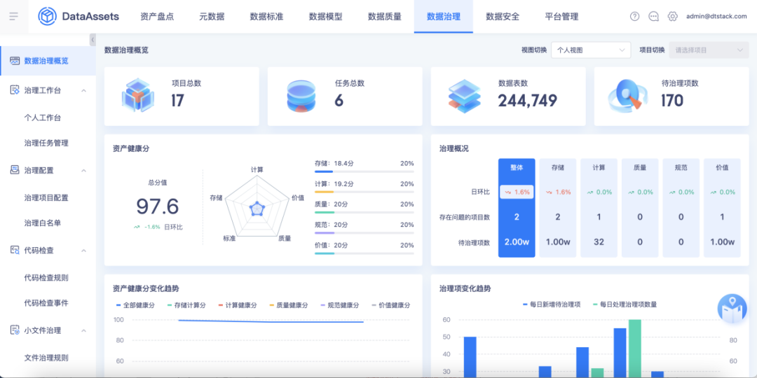 搭建数据治理工作台,从存储、计算、规范、质量、价值多个维度进行数据资产治理。