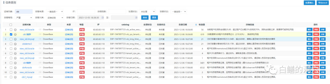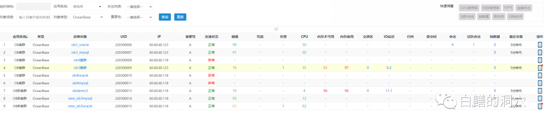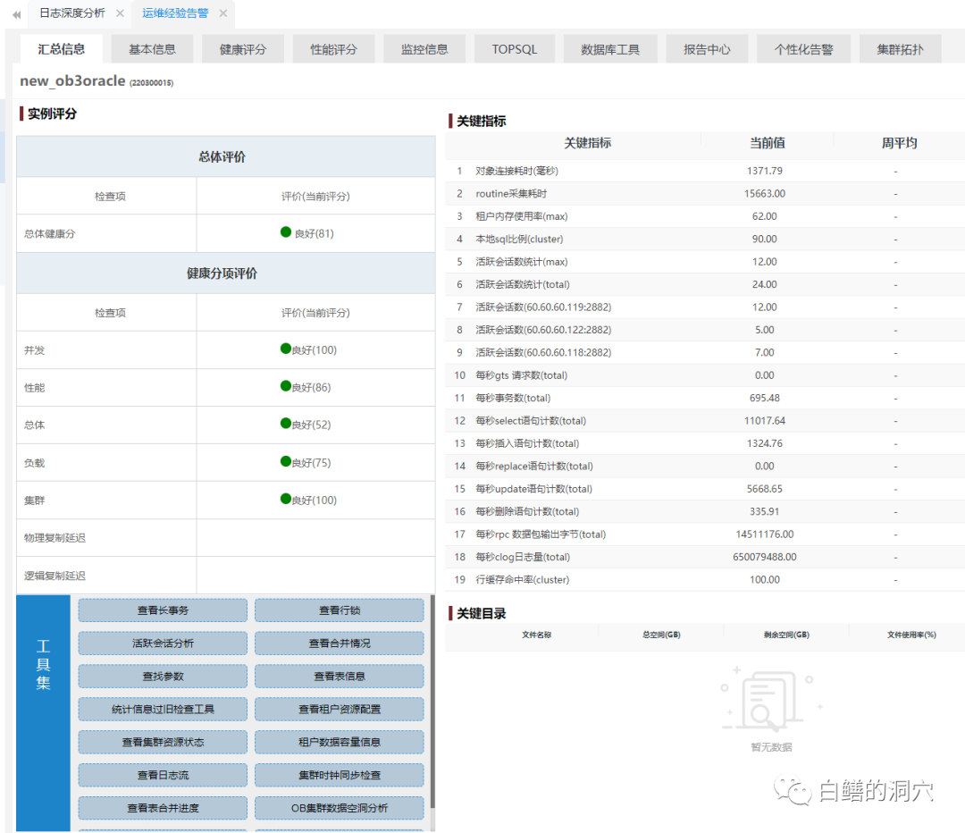压力环境下,数据库的告警不算多,主要的健康状态还是可以接受的。被压测的Oracle和MySQL租户的健康度还算不错。