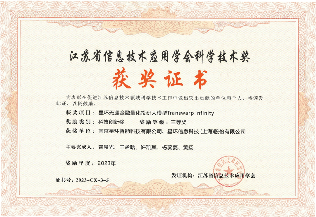近日,江苏省信息技术应用学会公布了2023年度江苏省信息技术应用学会科学技术奖、青年科技奖获奖名单,星环科技无涯金融量化投研大模型Transwarp Infinity荣获科学技术奖(科技创新)三等奖;星环科技唐剑飞荣获青年科技奖。