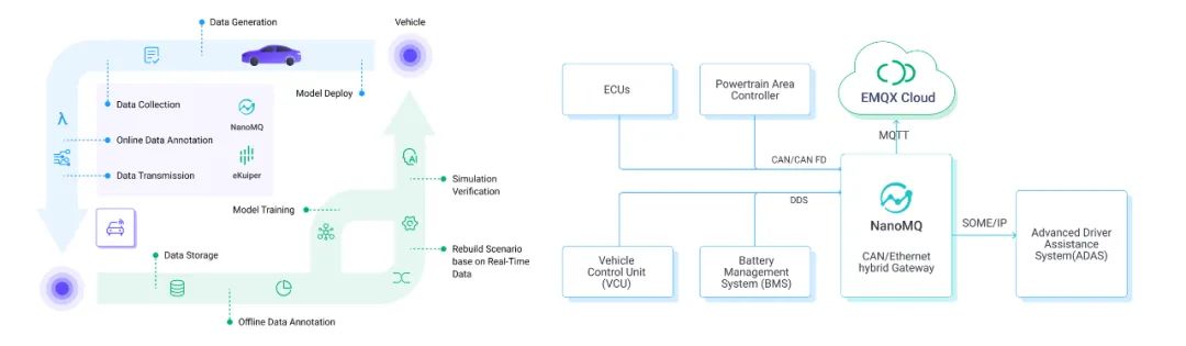 高数据可互操作性:数据闭环需要融合来自车内不同传感器的异构数据,EMQ 边缘计算产品 NanoMQ + eKuiper 可以提供丰富的数据范式转换能力,将来自 CAN 总线,车载以太网,视觉摄像头等不同来源的异构数据范式在车内的轻量流数据引擎中进行实时分析。