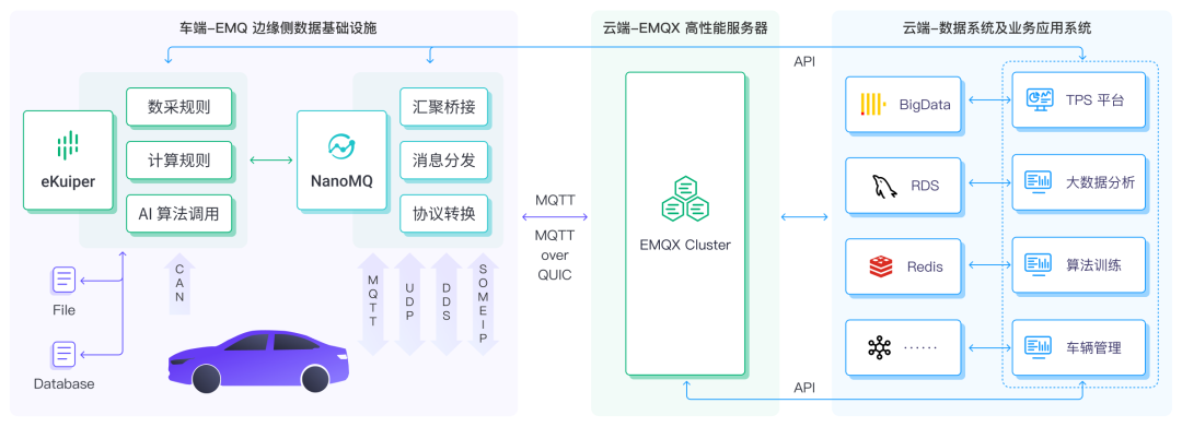 车云实时协同:车云数据交互正在从传统的数据上传后的事后数据分析,逐步转向基于车内边缘计算、车云服务协同技术实现事前数据分析。利用云边协同的数据基础软件,EMQ 可以进行车端数据的采集处理、计算、AI算法调用,并将数据统一桥接至云端的高性能 MQTT 服务器,在云端实现数据预处理,与数据库、消息队列持久化进行数据存储对接。
