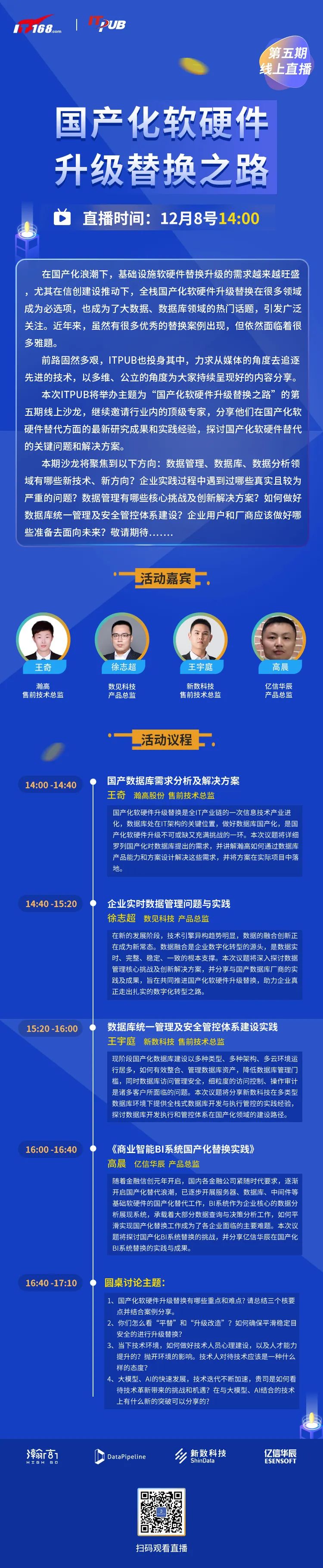 12月8日,在ITPUB「国产化软硬件升级替换之路」线上沙龙中,DataPipeline 产品总监徐志超将带来「企业实时数据管理问题与实践」为主题的分享,深入探讨数据管理的核心挑战和创新解决方案,并介绍与国产数据库厂商的合作经验及成果。