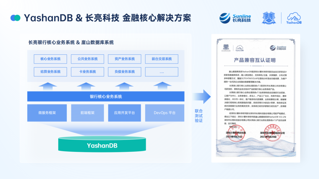 本次联合测试覆盖存取款、贷款、记账、查询交易等银行核心全量业务场景,经功能、性能、稳定性和高可用能力等多个维度的深入测试,崖山数据库YashanDB V22.2与长亮银行核心业务处理系统产品完全兼容、运行稳定且性能强劲,能够充分满足金融机构核心系统的建设需求,推动业务模式创新。此次联合认证为后续双方面向金融核心领域的深度合作奠定了建设基础,同时也将进一步助推创新型应用落地,加速金融业数字化转型发展。