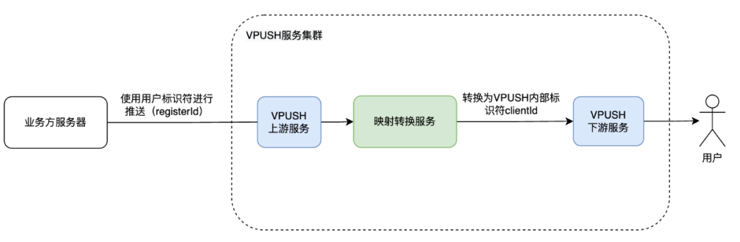 在消息推送系统中,业务方服务器通过调用推送接口向 VPUSH 服务发送消息,请求中会包含一个 registerId,用于标识接收该消息的用户设备。当 VPUSH 服务接收到推送请求时,会使用 registerId 找到对应的用户,并将消息推送给其手机。然而,在 VPUSH 内部处理消息推送时,需要使用一个内部标识符 ClientId 来标识每个用户的设备,可以通过 ClientId 查找到对应的设备信息。