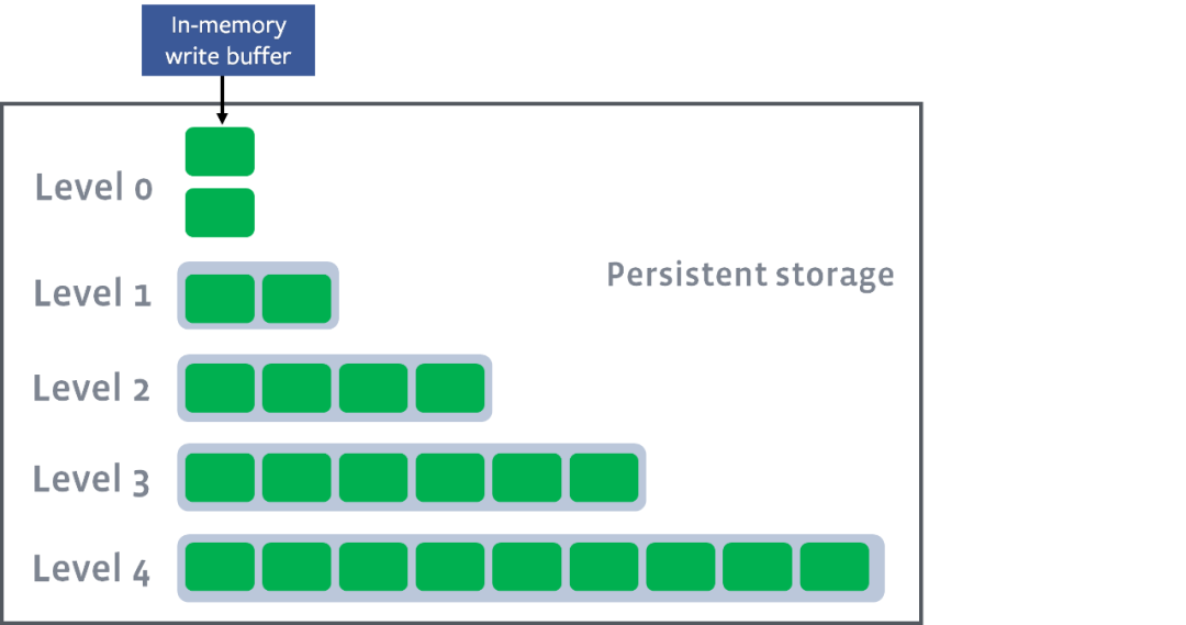 RocksDB 通过在写入数据时先存入内存来保证写入高性能,内存写满后便会将内存的数据转移到磁盘,写入磁盘时保持 key 有序来提升磁盘查询的效率(类似于二分查找),并且对磁盘中的数据进行分层,热点数据所在的层级越低,冷数据存储的层级越高。