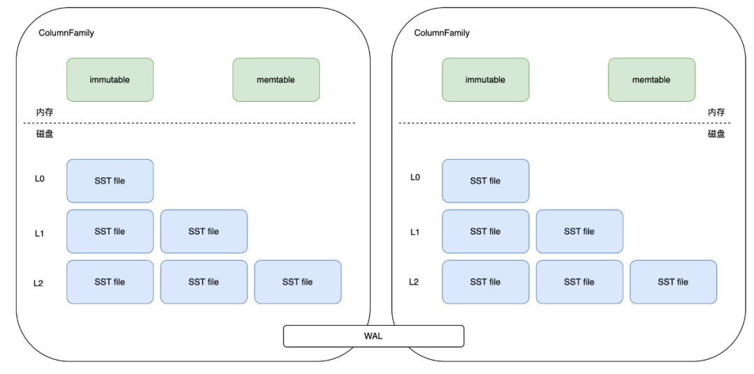 RocksDB 中会分出 ColumnFamily(列族,一系列 kv 组成的数据集,可以理解为就是一个 namespace),所有的读写操作都需指定 ColumnFamily,每个 ColumnFamily 主要由三部分组成,分别是 memtable/sstfile/wal。