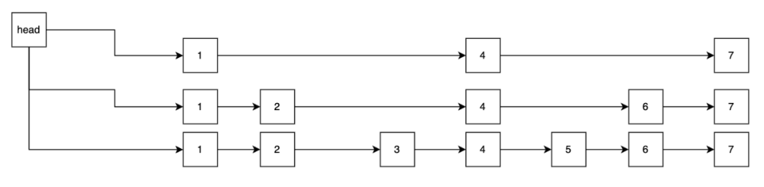 skipList/vector/hashLinkList。写入数据时通过对key进行字典序排序,保持有序。跳跃表的查找速度可以简单理解近似二分查找log(n)。跳表结构如下图所示