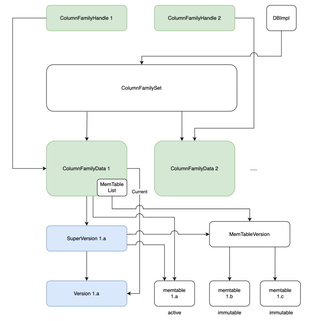 列族指针ColumnFamilyHandle指向了列族对象ColumnFamily,列族对象中存放有列族相关的数据:ColumnFamilyData。