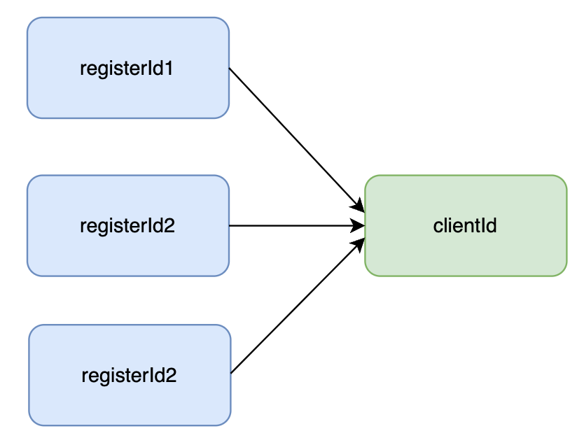 系统中除了 registerId 以外,还有许多其他的标识符,所以引入了 ClientId 来降低后期维护和开发的成本。由于regId 比较有代表性,下文中主要会以 regId 进行举例讲解。