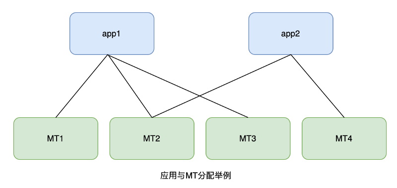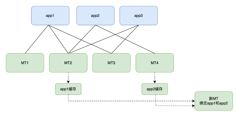 为了做到服务的高并发、高可用,每个应用的缓存以多副本的形式分散在多台 MT 服务器中,形成多对多的关系。例如,MT1、MT2 和 MT3 中均缓存了app1的全量数据,app2 的全量数据则存放于 MT2 和 MT4 中,如下图所示: