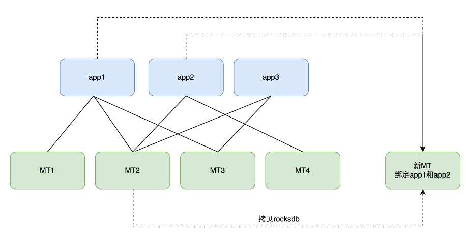 其中MT2机器中缓存有app1和app2,所以直接使用 rsync/scp 命令将 MT2 的 RocksDB 文件夹拷贝到新的MT机器中。