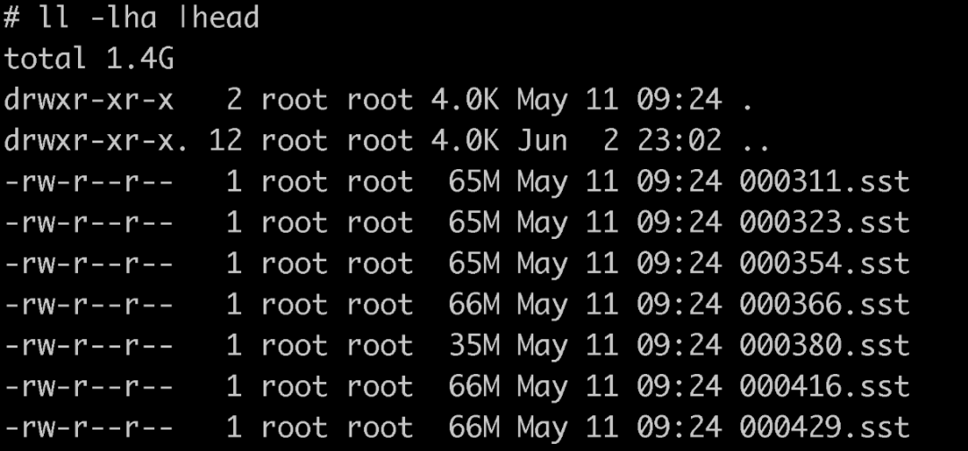 这个快照文件是一个硬链接,链接到了真实的sst文件中。如下图所示,该文件夹内便是生成的快照文件,其与真实的sst别无二致: