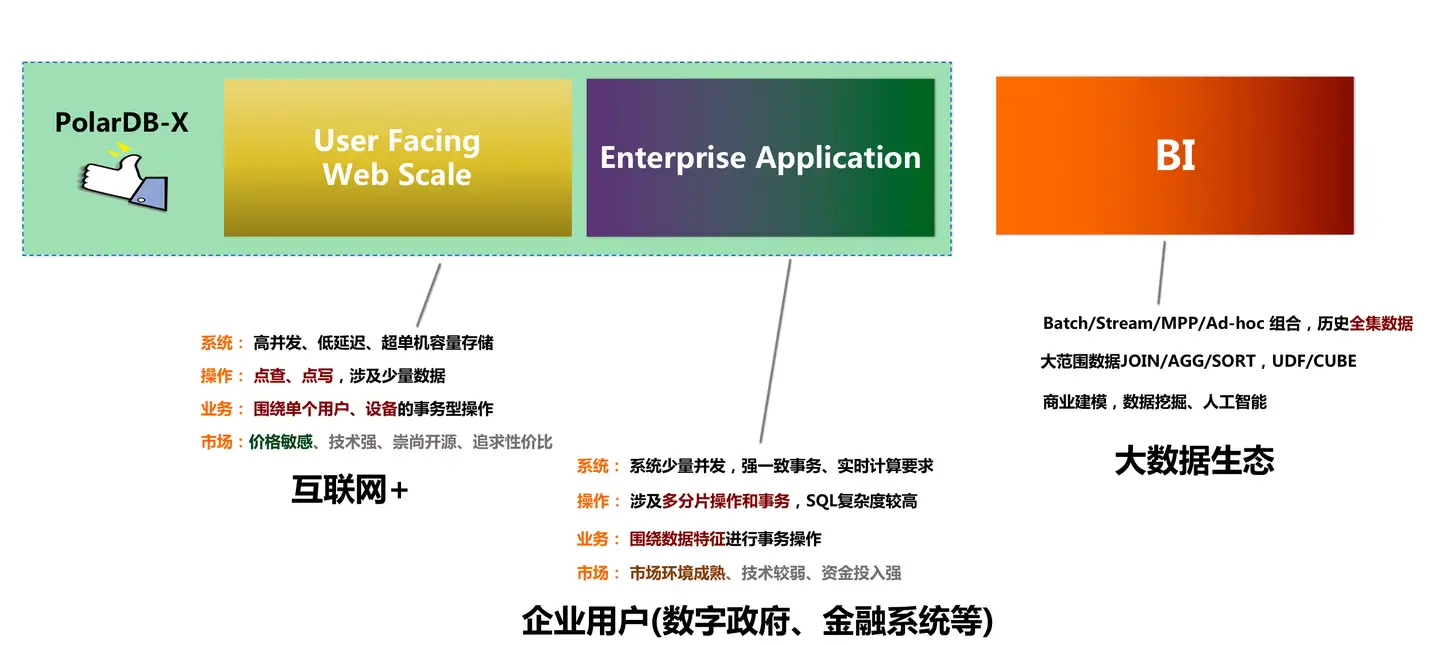 - 传统企业级应用因业务发展导致计算量与数据量呈爆发式增长,急需具备更强计算能力的在线事务型数据库场景,比如HTAP混合负载能力等。