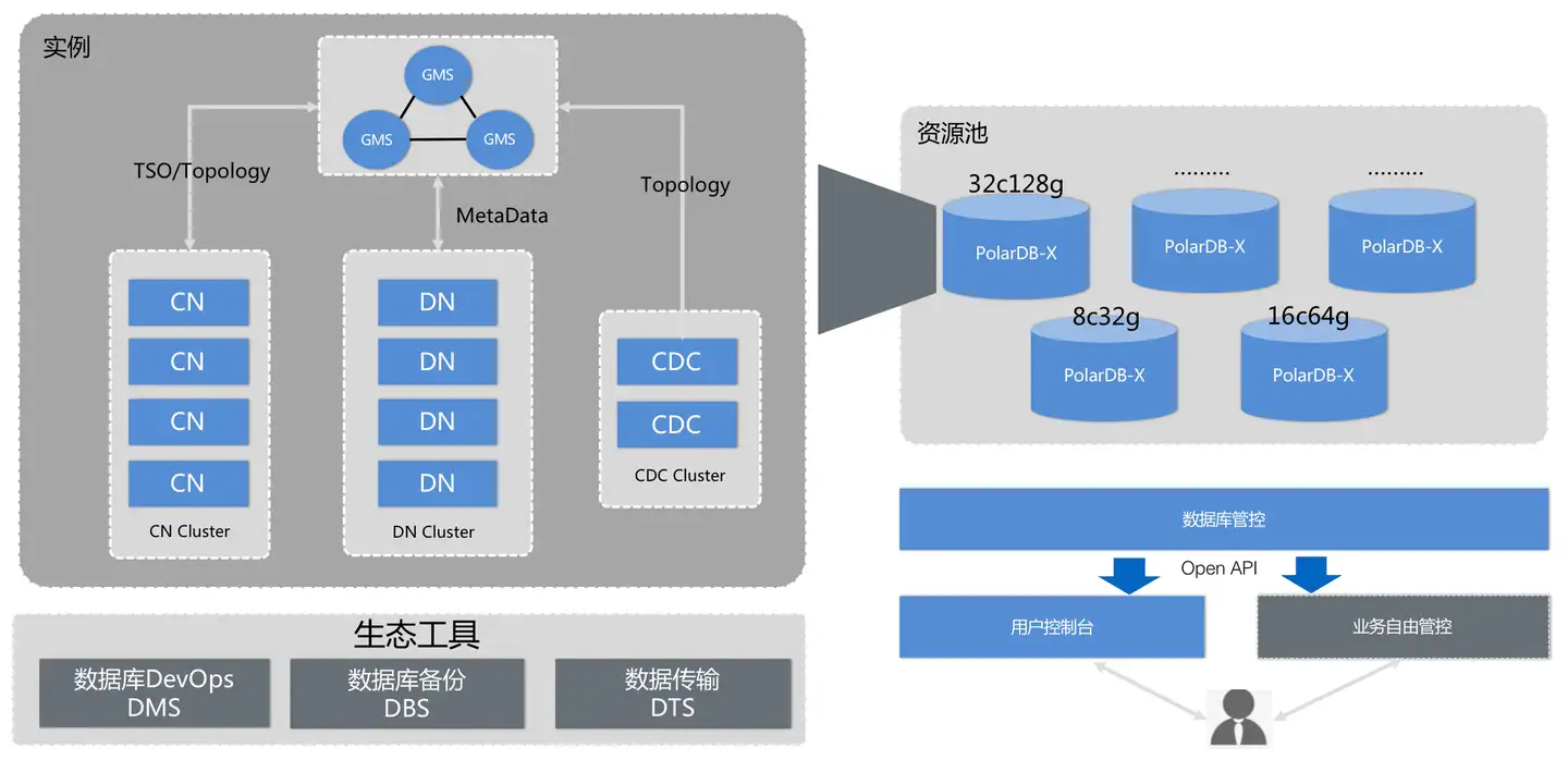 PolarDB-X整个组件的物理部署上,可支持公共云、线下专有云的全形态部署能力,交互上提供面向后台的数据库管控和用户控制台,用户也可以基于OpenAPI完成管控集成。