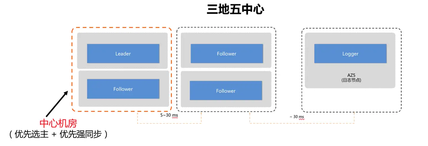 阿里目前多地架构会有中心机房的诉求,比如:应用因其部署的特点,往往要求在未发生城市级容灾的情况下,仅在中心写入数据库,数据库的leader节点在正常情况下只在中心地域;同时又要求在发生城市级容灾的时候(同一个城市的多个机房全部不可用),可以完全不丢失任何数据的情况下,将leader点切换到非中心。