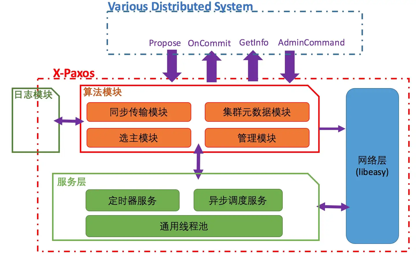 X-Paxos的整体架构如上图所示,主要可分为网络层、服务层、算法模块、日志模块4个部分