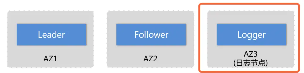 当然还有其他的组合方式,通过对节点角色的定制化组合,我们可以开发出很多的定制功能节点,即节约了成本,又丰富了功能。 比如下面的三副本部署,其中一个Follower节点配置为仅做logger模式(参与多数派投票,但不存储数据),这样可以将三副本的3份数据成本优化为只有2份: