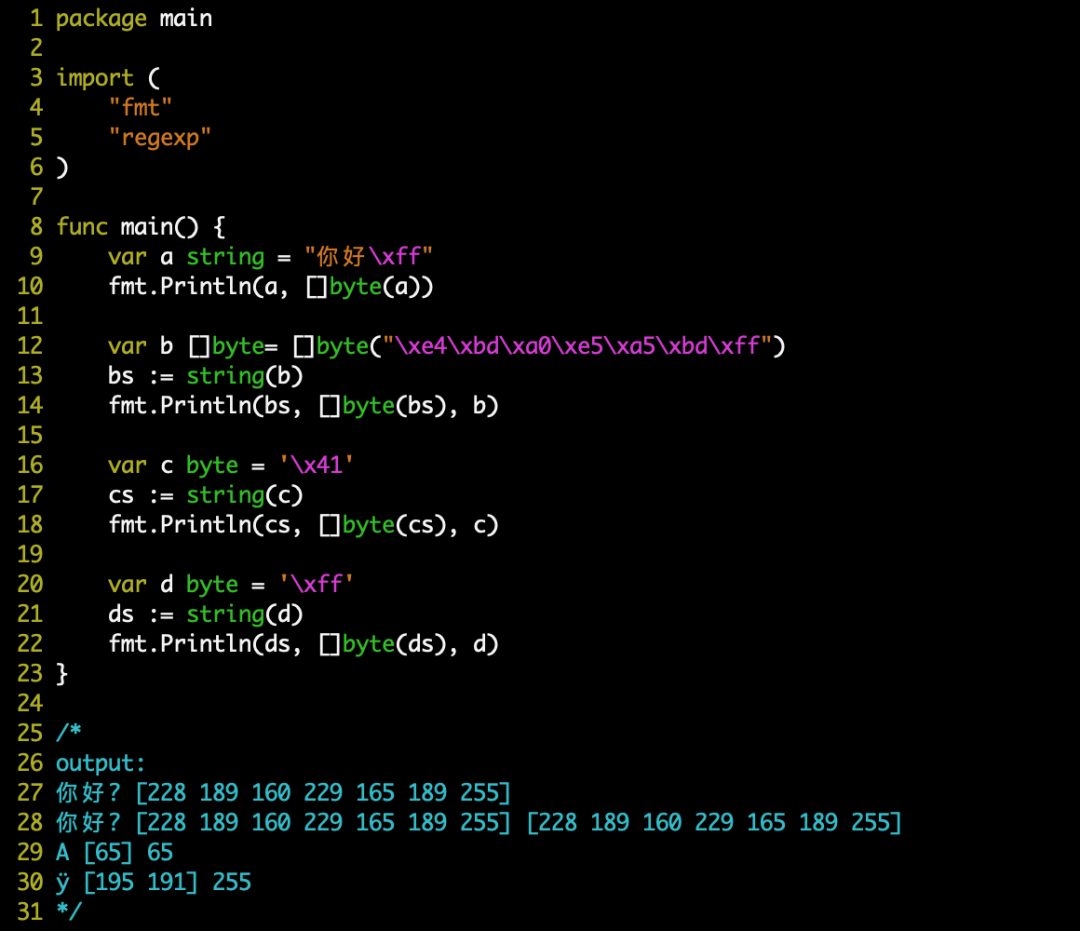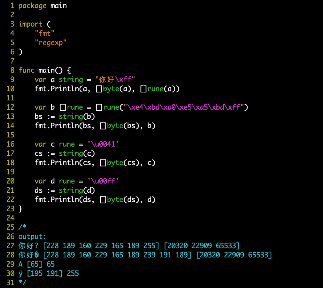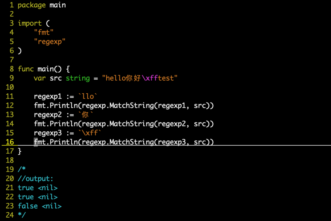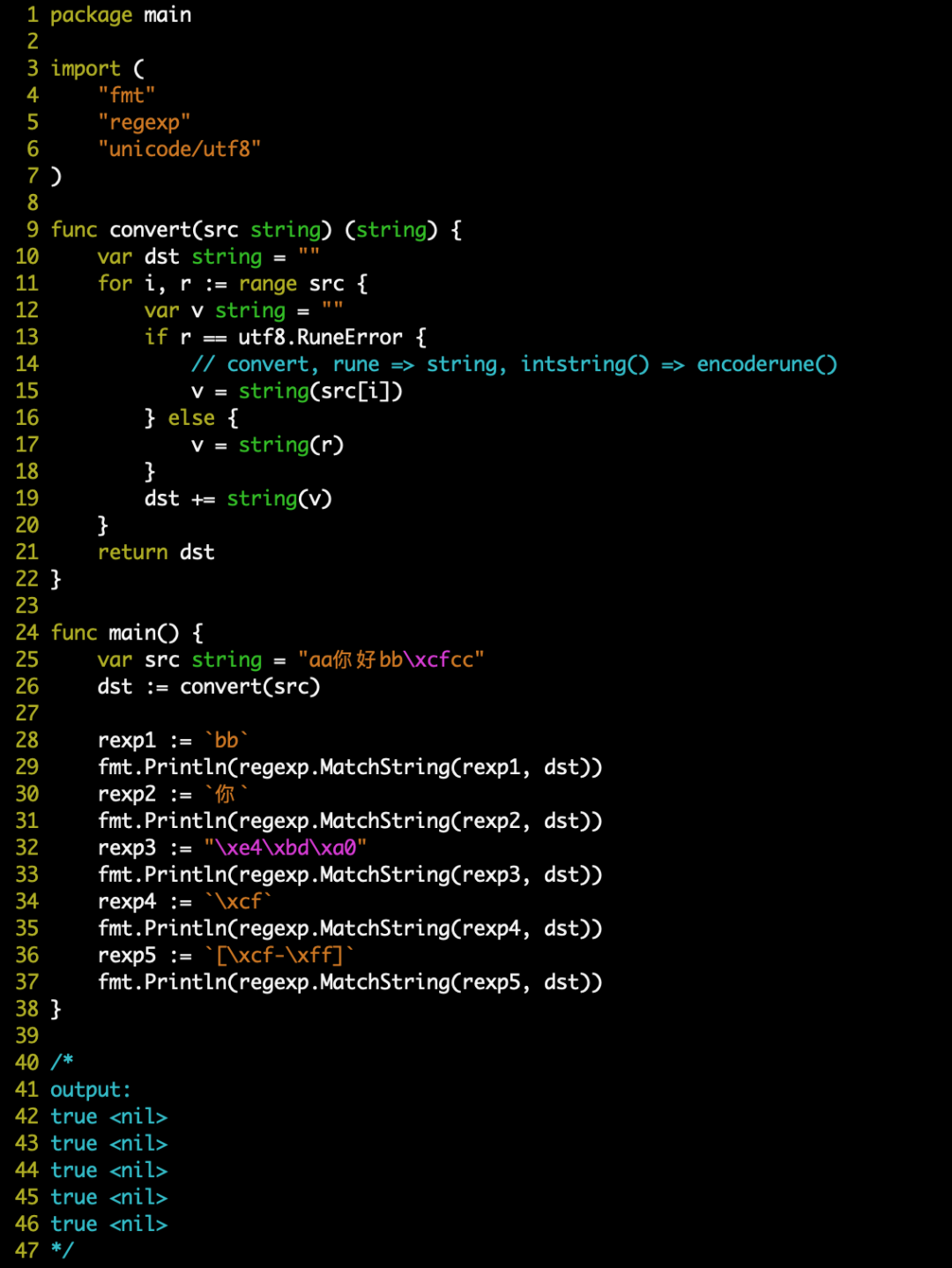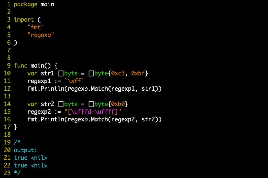 regexp匹配的问题到这里就解决了,在不断深入语言实现细节的过程中发现:Golang 本身在尽可能的保持 UTF-8 编码的一致性,但在编程中字节序列是不可避免的,Golang 中使用