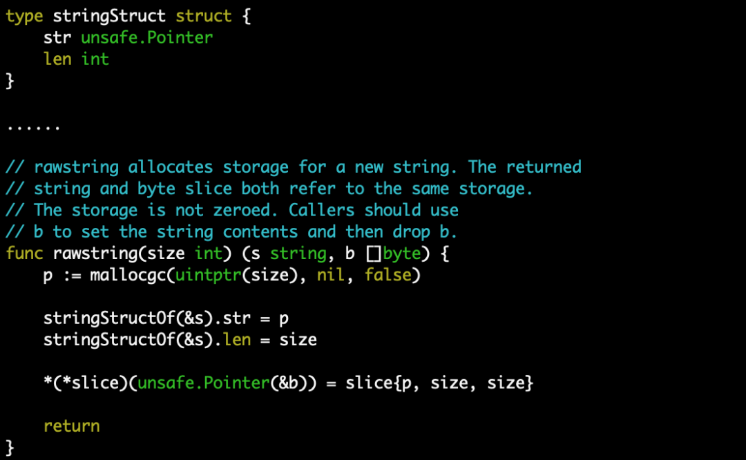 string是固定长度的字节序列,其定义和初始化在 https://github.com/golang/go/blob/master/src/runtime/string.go,可以看到