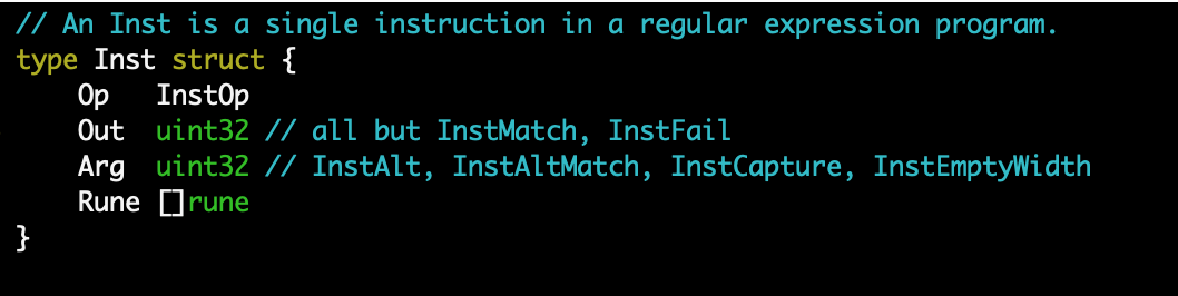 rune类型存储字符(https://github.com/golang/go/blob/master/src/regexp/syntax/prog.go#L112),所以