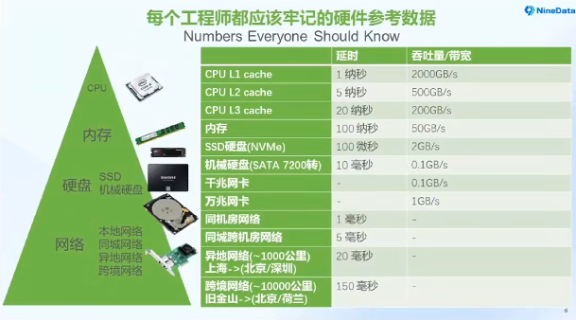 斗佛视频号最新的一期讲解了硬件性能数据的基础知识,包括了CPU各级缓存、内存、机械/固态硬盘、网卡、机房等延时和吞吐量数据,我认为是非常有用的内容,虽然只是一些经验值,但是了解这些,就能为我们进行系统设计、技术选型等工作的时候,提供更科学的数据参考,做到有"数"可依,定量评估,更加科学。