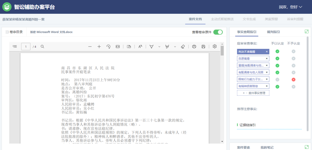 其实,这并不是国双产品团队对智能文案、智能写作等行业智能化应用的首轮探索。早在2017年为检察机关需求设计、定制、开发的最新一代智能办案辅助系统中,针对公检法司普遍面临的“案多人少”的客户痛点,技术专家就已尝试搭建智能语音办案、 审前文件过滤、阅卷审查重点标注与高亮识别、自动文书自动生成、智能文书校对等丰富的司法领域所需的智能化应用,并在项目落地、用户大量使用的过程中沉淀实践经验。例如在使用国双辅助办案平台辅助法官审判的工作中,可以让原本需要4个小时才能处理完成的案件,仅需10分钟就可以处理完成,无疑展现出了数智技术对司法质效提升的强大助力。