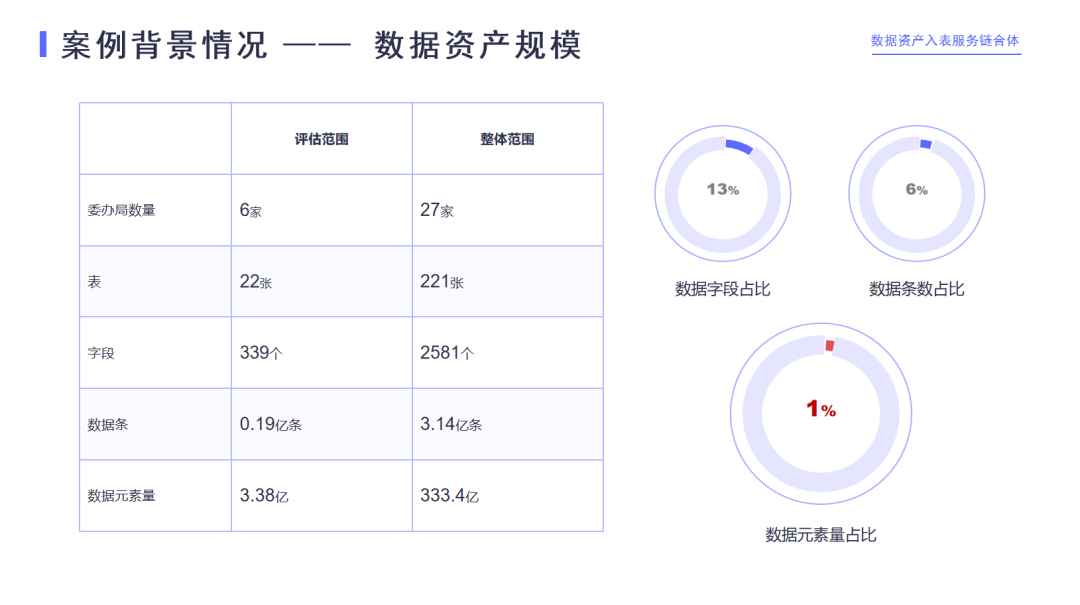 B公司的数据资产是授权来的,授权范围包含27家当地政府的委办局 221张表2,500多个字段3亿多条数据,但资产评估的范围实际上只是其中的很小的一部分,切割出了两个比较明确的商业应用场景,其中对应的字段涉及到6家委办局22张表 339个字段接近2,000万条数据 。