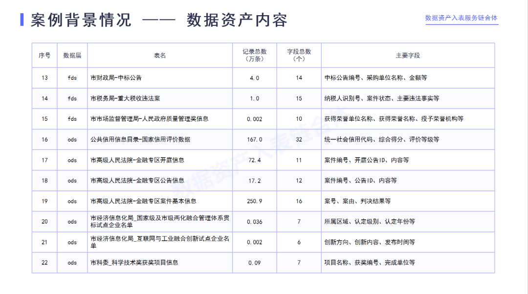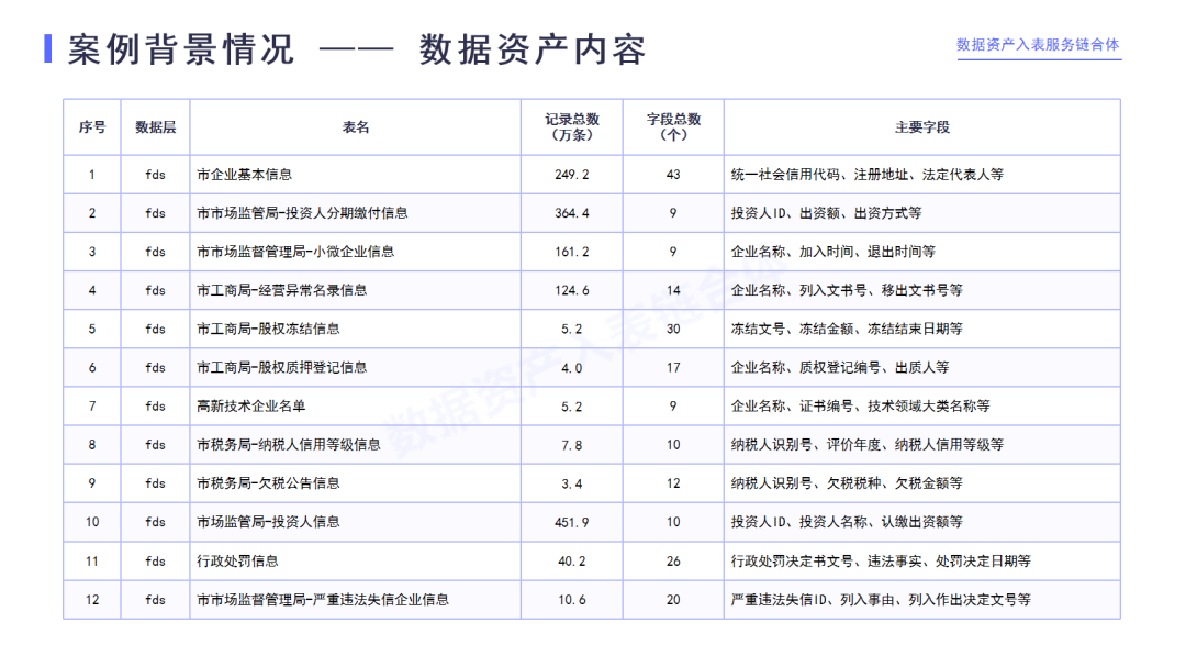 数据资产22张表包含企业基本信息表的主要字段包括统一信用代码、注册地址、法定代表人等,也包含市场监管局的投资人ID、缴付信息、严重违法、失信企业信息等一系列的字段,工商局三张表即股权冻结的信息、股权质押的信息、经营异常的名录,也包括企业名称、冻结文号、冻结金额、质押登记号等一系列的字段;税务局三张表,即纳税人的信用等级信息、欠税公告、重大税收违法信息,包括纳税人的识别号、年度欠税的税种、欠税金额、违法事实等字段;财政局也有中标公告的表格,人民法院有金融专区的开庭信息、公告信息、案件基本信息,经信局的国家级市级两化融合管理体系贯标试点企业名单、互联网与工业融合创新试点企业名单,科委的科学技术创新奖的项目信息以及行政处罚高新技术企业名单、公共信用信息名录等等一系列的信息。